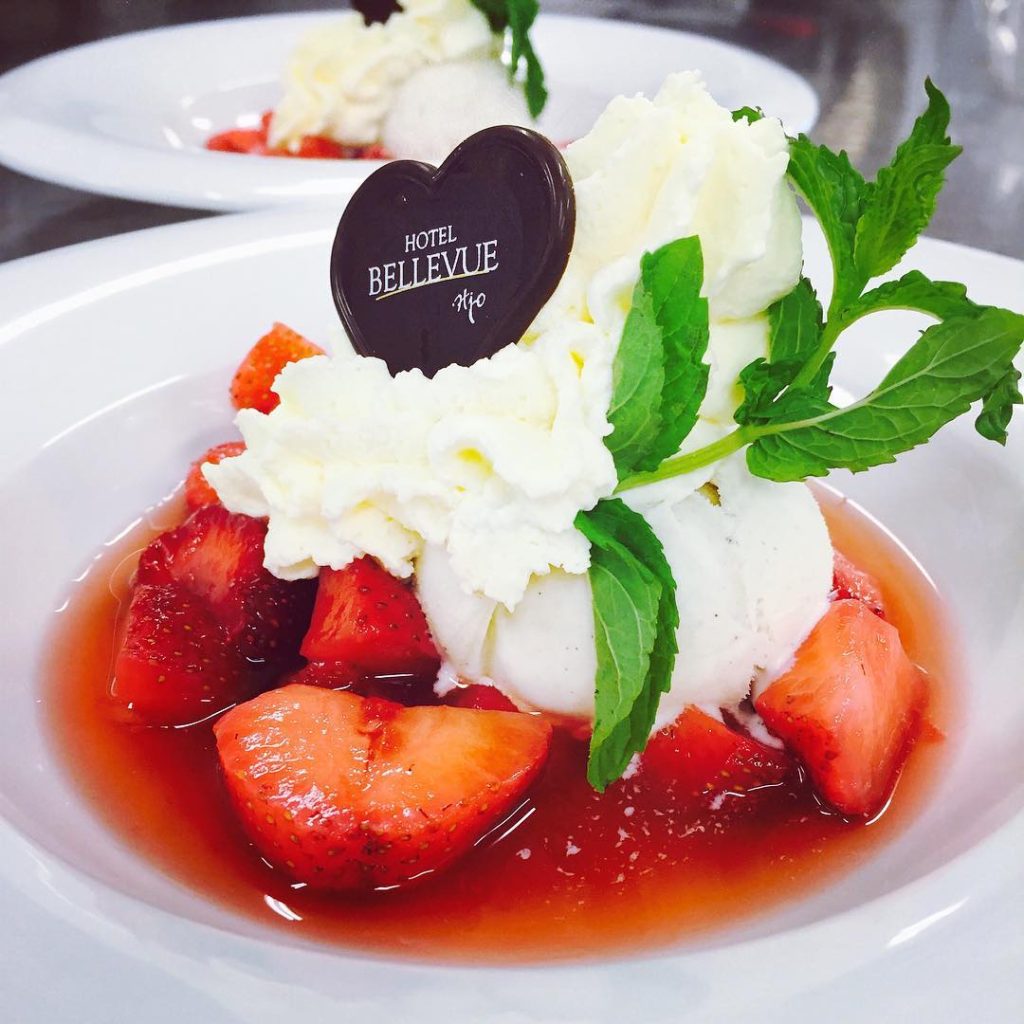 Hela dagen erbjuder vi dessert med jordgubbar samt glass eller grädde.